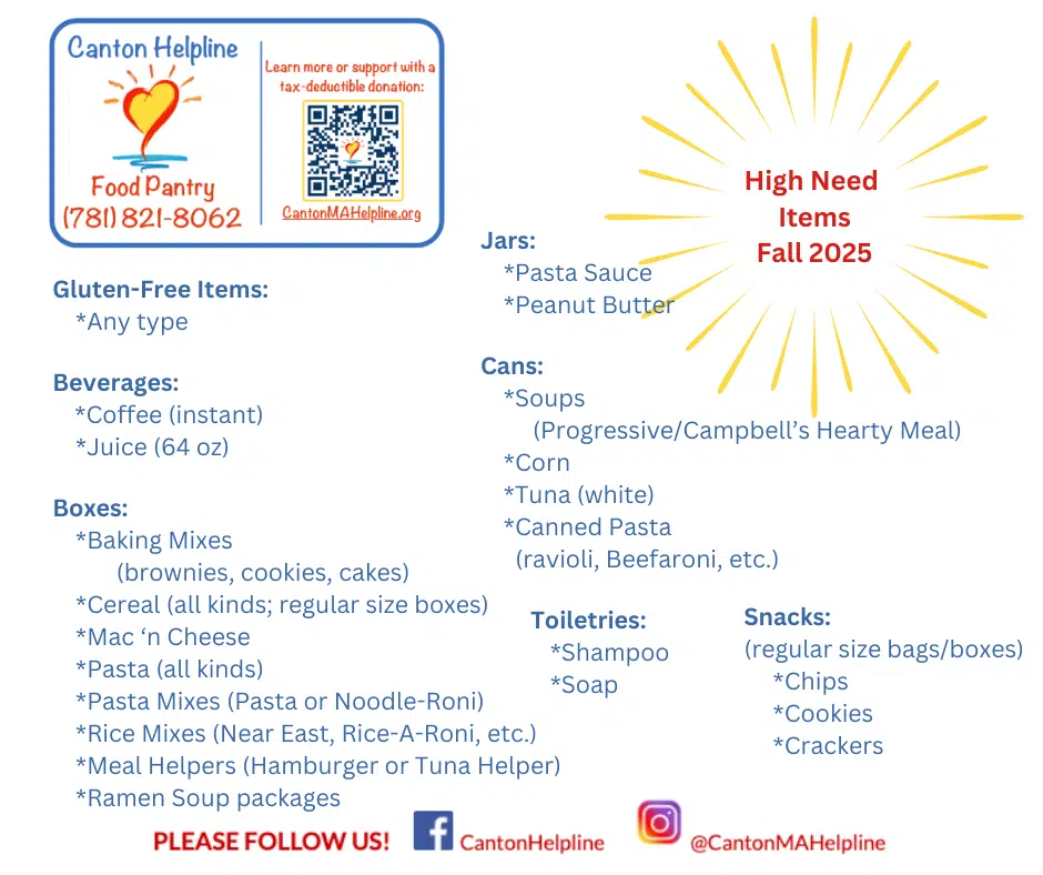 Please see the flyer below from the Canton Helpline Food Pantry for a list of their high-need items this Fall.