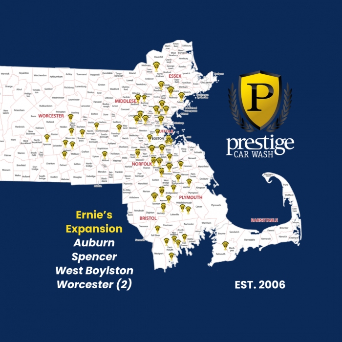 Prestige Car Wash, a premier provider of car wash services across Massachusetts, is pleased to announce its expansion into the Worcester area with the acquisition of five Ernie’s Car Wash locations. This acquisition marks an exciting step in the company’s growth strategy and enhances its ability to provide convenient, high-quality car care to a broader customer base. Prestige Car Wash is currently operating 23 locations statewide with the addition of Ernie’s, Prestige Car Wash is on track to have 34 locations open by the end of 2025.
